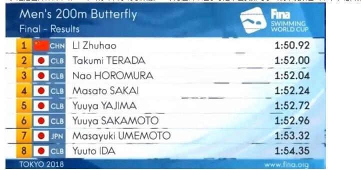 李朱濠的这个成绩也刷新了由他自己保持的全国纪录,获得第二名的日本选手的成绩是1分52秒整,比李朱濠慢了1秒08;而获得第8名的日本选手的成绩是1分54秒35,比李朱濠慢了3秒43。