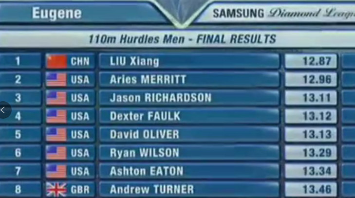 答案是肯定的!2012钻石联赛美国尤金站中,中国飞人刘翔领衔出战男子110米栏比赛,刘翔被分在了第5赛道,由于当时的劲敌罗伯斯缺战,刘翔在尤金最大的对手仍是以奥利佛、理查德森、梅里特为主的美国军团。