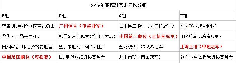 中超冠军上港进入H组,同组对手包括了澳超球队悉尼FC,日本J联赛冠军川崎前锋,以及韩/马/中国香港三国球队组成的资格赛分区晋级球队。