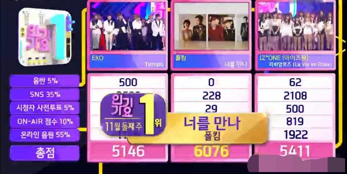 在11月11日的韩国打歌节目《人气歌谣》中,EXO与PaulKim,IZONE分别争夺一位,似乎EXO取得一位并不是已经奇怪的事情,因为在三位之间,EXO的国民度和粉丝度可以说是最高的,而最后的结果却令粉丝大惊,PaulKim取得了一位,EXO却为第三。
