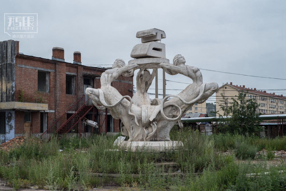 2018年7月24日,内蒙古牙克石市图里河,市政雕塑被野草包围。