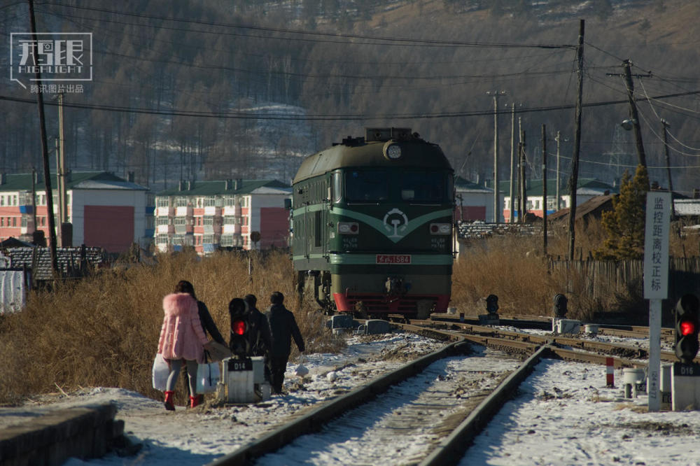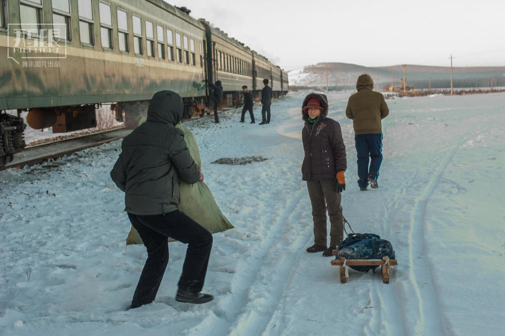 2015年1月29日,内蒙古海拉尔至满归4181次绿皮车停靠小站,人们冬天用爬犁把生活用品带回家。