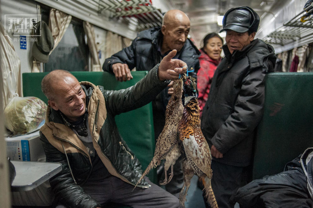 2015年1月29日,黑龙江齐齐哈尔至古莲6245次列车上,一位乘客展示山里捕获的野鸡。