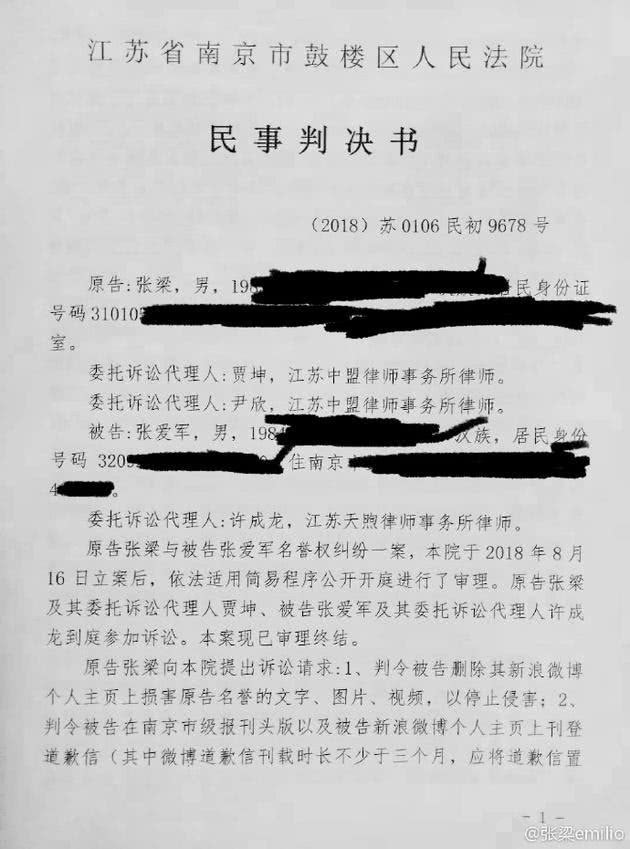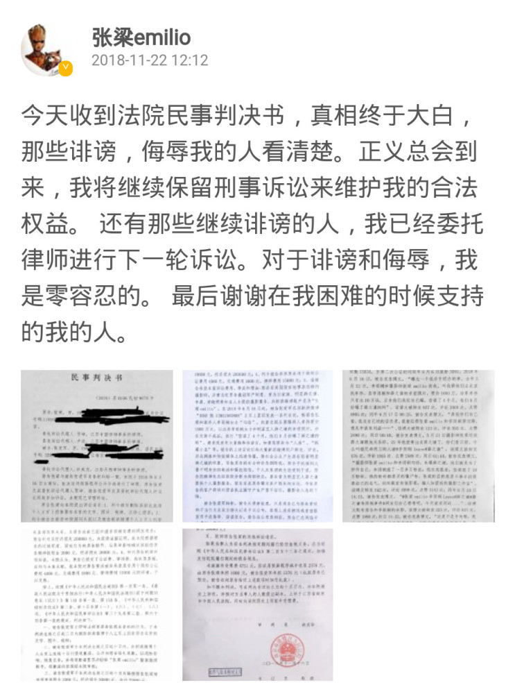 近日,审判的结果也出来了,判决书正文称:“被告公开向原告赔礼道歉,并将道歉置顶@张梁emilio。”“被告赔偿原告张梁合计4.2万元。”等内容,看来法院也是还了张梁一个清白了。