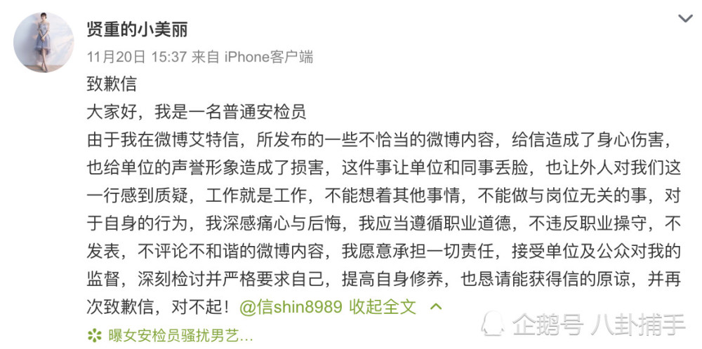 倒是这位涉事女安检员在事发后不久发布了道歉微博:我让单位丢脸,应当遵循职业道德,不发表不和谐的微博内容,提高自身修养。
