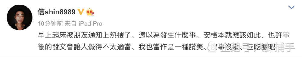 信称:早上起床被告知上热搜,还以为发声什么事,安检就该如此,也许事后的发文让人觉得不适,我也当做是一种赞美,没事没事,去吃饭吧。