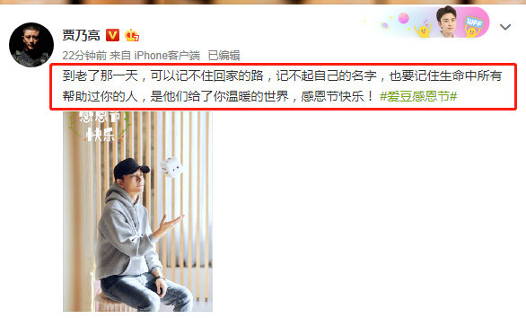 11月22日,正值感恩节,低调的贾乃亮也罕见现身,他非常动情的说道:到老了那一天,可以记不住回家的路,记不起自己的名字,也要记住生命中所有帮助过你的人,是他们给了你温暖的世界,感恩节快乐。