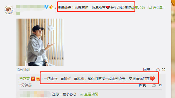 暖心老大哥贾乃亮看到粉丝的这些夸奖,反而越发低调了,非常走心的回应粉丝道:一路走来,有彩虹,有风雨,是你们陪我一起走到今天,感恩有你们在。