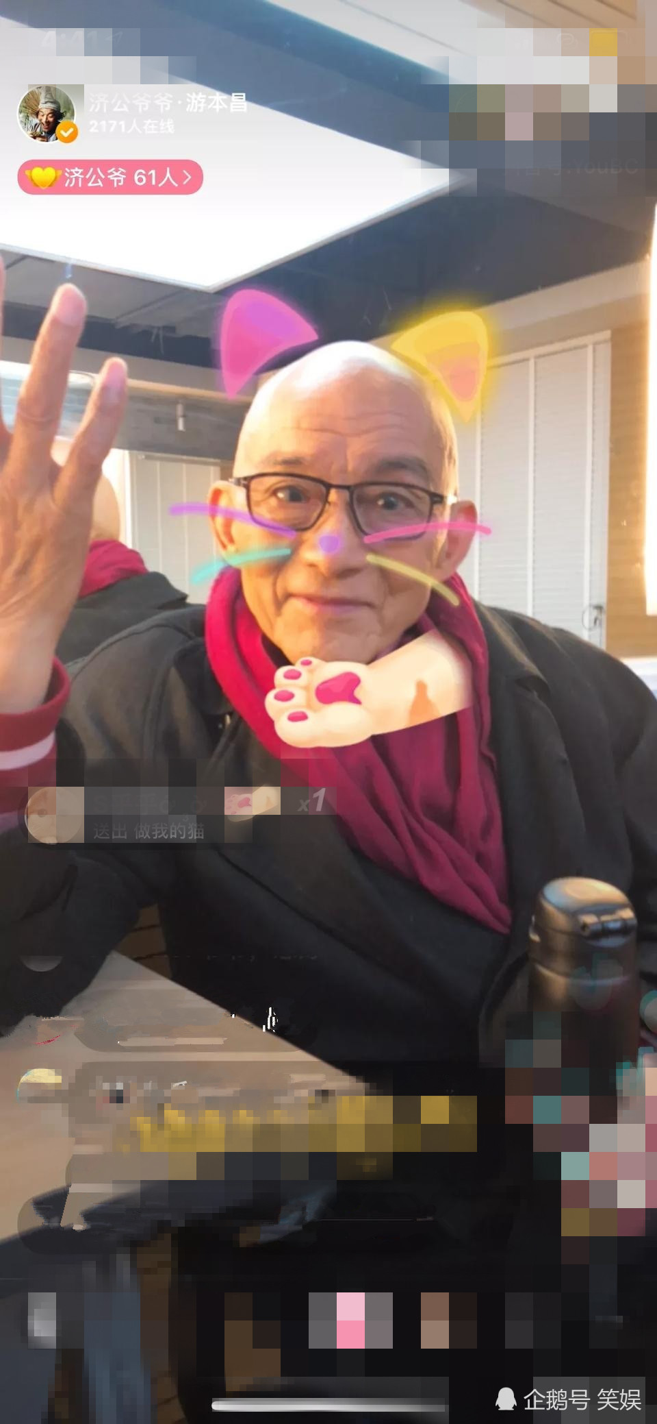 今天他在微博上晒出了自己的两张加了滤镜贴纸的照片,老年的他心态十分好。没有向平常老人逛公园打麻将,他选择了将自己的快乐传播给别人,开直播分享人生故事,俨然成为了一名正能量“网红”。