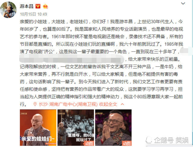 游本昌曾表示虽然自己已经86岁了,却对网络新生事物十分感兴趣,他表示现在年轻人玩的那些他早在六十年前就玩过了,为了给大家带来快乐的正能量,他直播、发心灵鸡汤微博、拍视频,还亲切的称呼粉丝们为娃娃。
