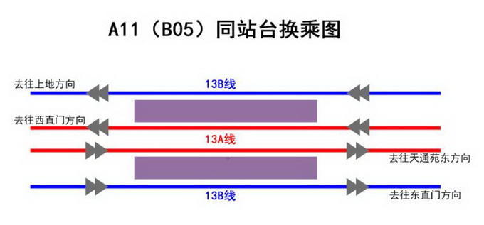 回应:13A和13B线通过在西二旗站至龙泽站间、京藏高速以西新建的车站进行换乘,两线可实现同站台换乘,换乘方式与轨道交通4号线与9号线的国家图书馆站相同。