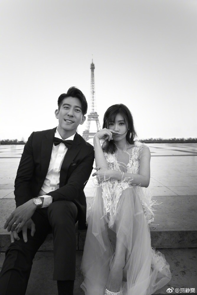 而这张黑白色调的婚纱照更有一种别样的浪漫。两个人坐在台阶前,身后就是浪漫的巴黎铁塔,贾静雯对着镜头做搞怪表情,修杰楷帅气对镜头微笑,果然是男帅女美!