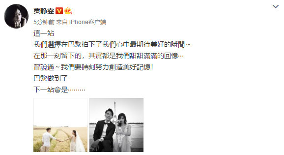 据悉,贾静雯与修杰楷2015年结婚,但是并没有举办婚礼。今年,有消息称11月贾静雯会与修杰楷在巴厘岛补办婚礼,虽然两人一直都表示补办婚礼会在日程中计划,但并未有任何举动。这次两人专程前往巴黎拍摄婚纱照,想必两人的婚礼也会很快提上日程,先说一句恭喜恭喜啦~