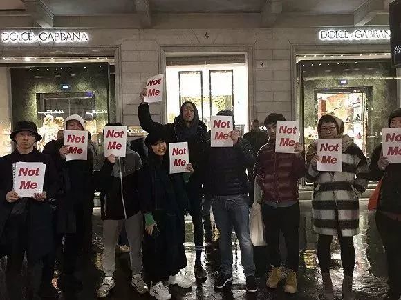 另有媒体报道称,已有华人聚集在Dolce & Gabbana米兰总部门口抗议,人们手中举着的抗议牌上写着”Not Me“。