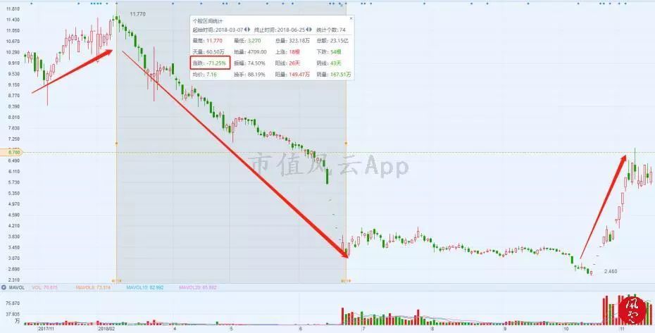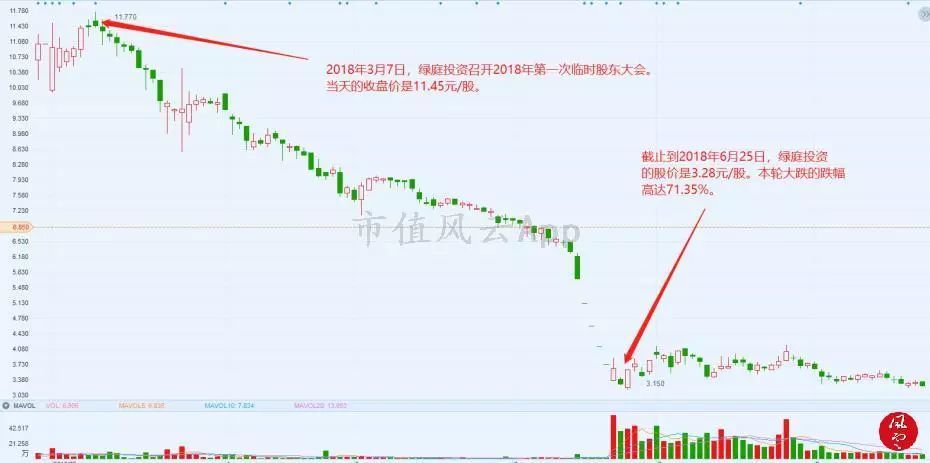 从上图可以得知,绿庭投资的股价在区区不到4个月的时间里大跌71.35%,从2018年3月7日的收盘价11.45元/股下跌到6月25日的3.28元/股,跌幅高达71.35%,A股市值蒸发了接近30亿。