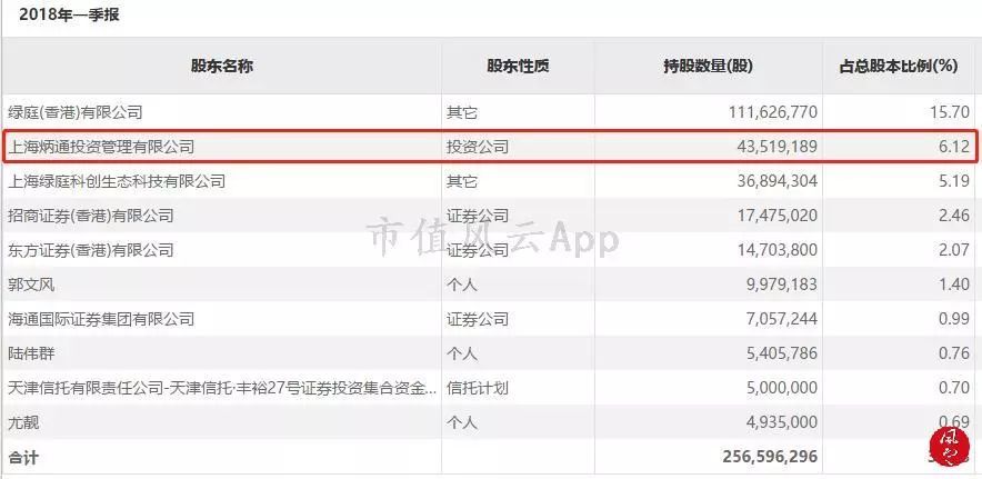 随后,绿庭投资2018年一季报的十大流通股东列表中显示,截止2018年3月31日,上海炳通累计持有绿庭投资4351.92万股股份,持股比例占公司总股本的6.12%,为公司第二大股东。