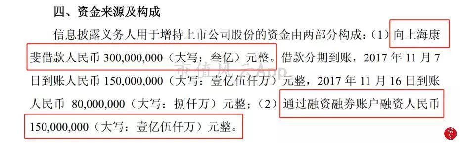 从上图得知,增持资金的来源是上海康裴信息技术有限公司(3亿元)(以下简称“上海康裴”)和用3亿元借款作为担保而融资的资金(1.5亿元)。
