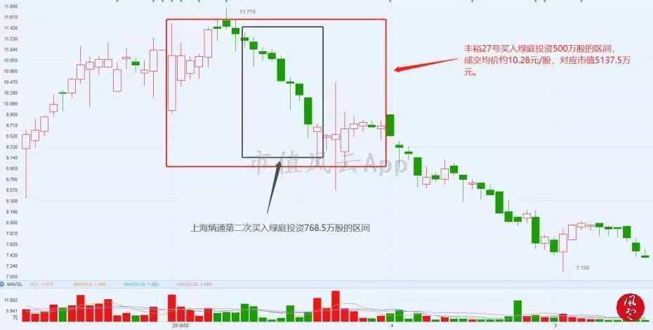 经测算,丰裕27号买入绿庭投资股份的成本均价大约是10.28元/股,持有绿庭投资股份的市值大约是5137.5万元。