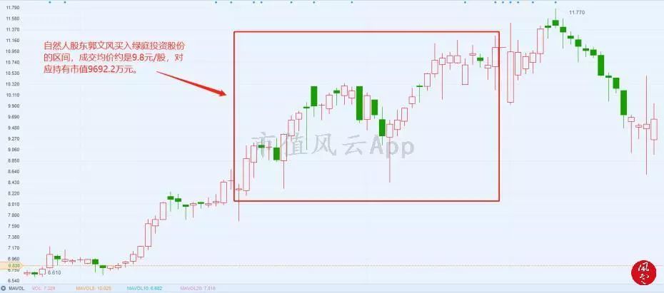 根据绿庭投资的相关公告,郭文风郭先生在2017年11月24日首次出现在绿庭投资的十大流通股东列表中,经测算,郭先生的成本均价大约是9.8元/股,对应持有市值是9780万元。