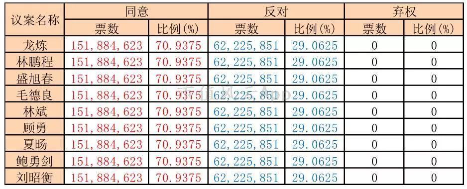 从上图可得知,在董事会改选议案的现场表决中,9位董事会董事候选人获得的同意与反对的票数是完全一样的!