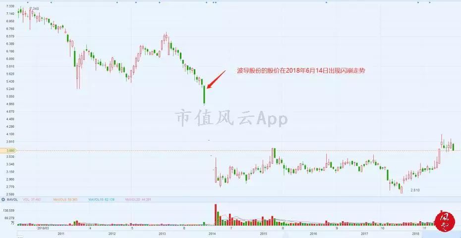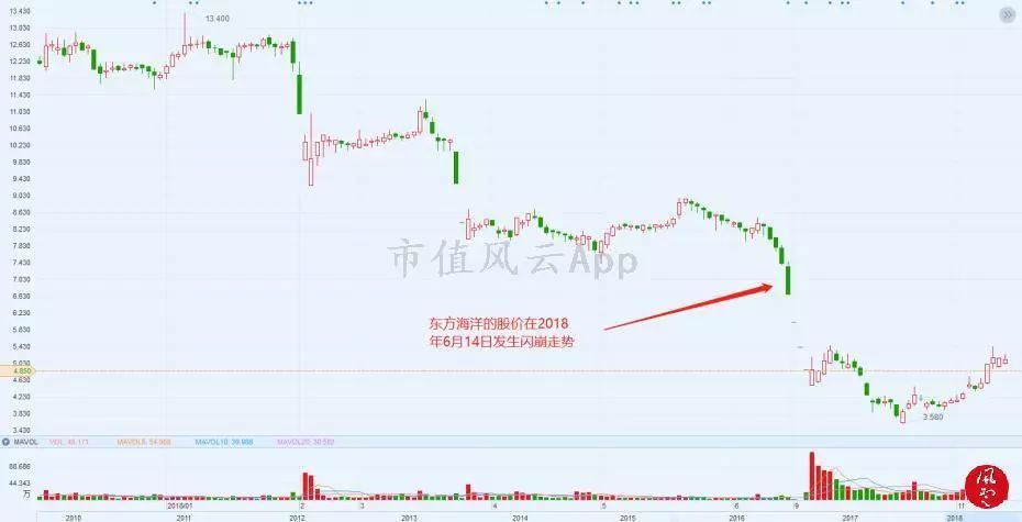 非常巧合的是,波导股份和东方海洋的股价走势与绿庭投资的股价走势惊人相似。三只股票都在2018年6月14日起出现闪崩走势。