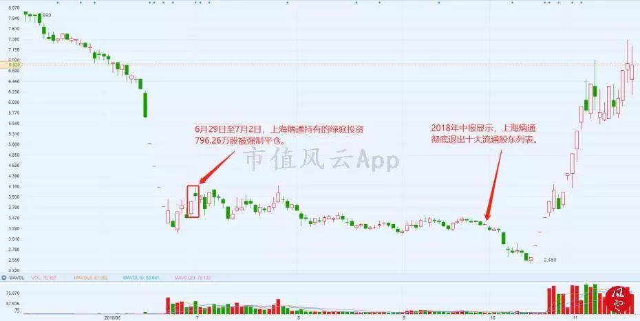 而绿庭投资在这一轮暴跌中,股价曾下探到3.28元/股,如果上海炳通不及时补仓,将发生强制平仓的风险。