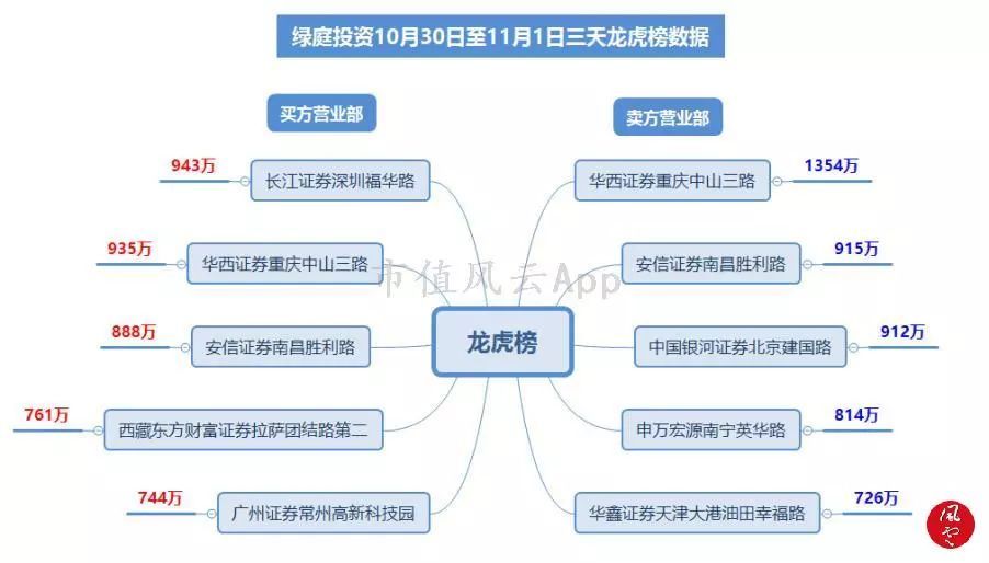 从这10多家营业部的活跃程度以及三日上榜的成交额、成交额占比等综合判断,绿庭投资自10月30日以后的接连涨停是比较标准的游资资金对倒、拉抬股价的模式。