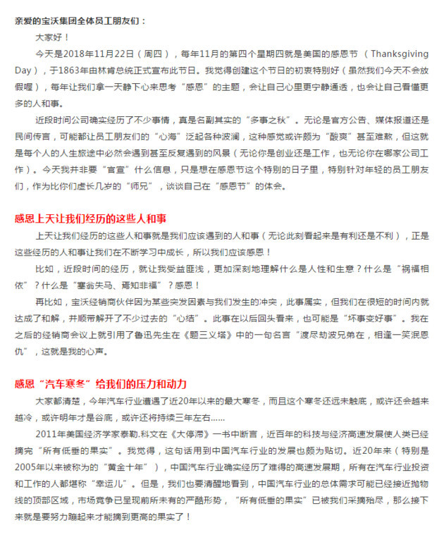 11月22日,宝沃汽车总裁杨嵩发表致宝沃集团全体员工的第10封信。在公开信中,杨嵩谈及此前曝出的51家经销商向宝沃表达不满之事,称“此事属实,已与经销商伙伴达成和解”。