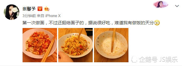 11月22日晚,张馨予又在网上秀恩爱了,她在微博发文称:“第一次做面,不过还挺给面子的,据说很好吃,难道我有做饭的天分”,言语里都透露出了此刻的小幸福。