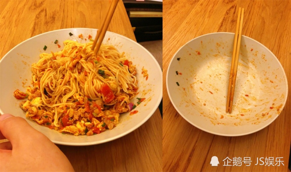 老公何捷也非常给力,看到老婆亲自下厨为自己做面,三下两下就给吃光光了,这个“光盘”可以说是对老婆厨艺最高的肯定了。