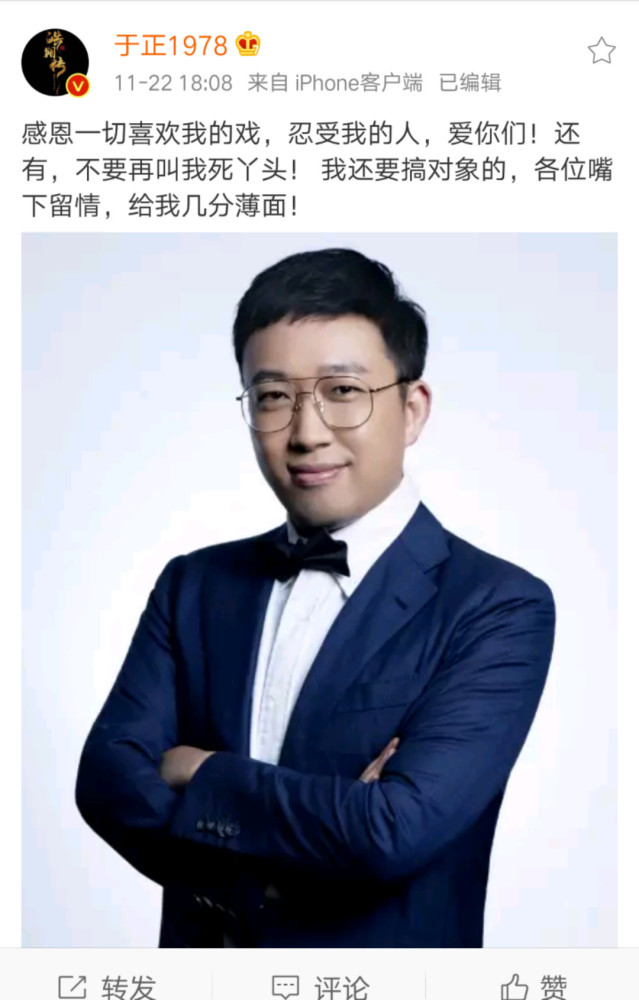 并在发文中感恩大家对他的喜爱以及支持,表达了对观众的感激之情。同时还非常幽默的控诉观众给他起的外号“死丫头”,请求观众不要再这样叫他,于正调侃称自己还要找对象,需要大家给他留点面子。