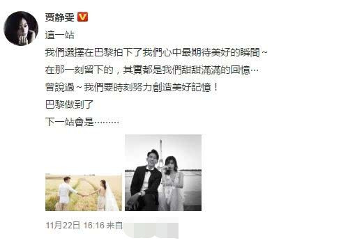 11月22日,贾静雯在微博晒出婚纱照,并配文:“这一站,我们选择在巴黎拍下了我们心中最期待美好的瞬间~在那一刻留下的,其实都是我们甜甜满满的回忆……”