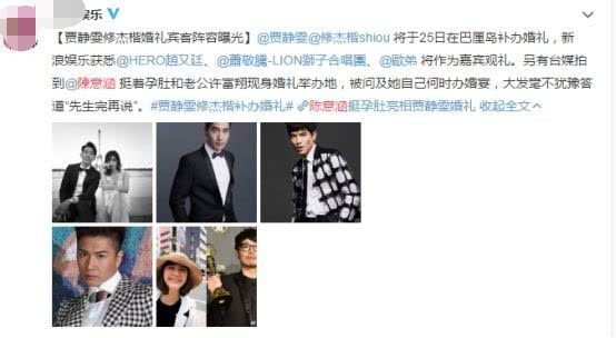 贾静雯与修杰楷相恋4年,登记结婚也已有三年,相继生下咘咘和Bo妞两个女儿,但一直没有举行婚礼。今年8月份台湾媒体就曝出过两人将在11月于巴厘岛补办婚礼的消息。当时修杰楷的经纪人在接受采访的时候说:“对他们来讲一定是希望可以做的事,只是说到底是什么时间点或是在哪里,现在真的不知道,尤其我们现在都在拍戏正忙”。