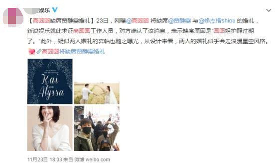 11月25日,贾静雯和修杰楷在巴厘岛补办婚礼,22日两人就携两个女儿乘机飞往了巴厘岛。此次补办婚礼,贾静雯修杰楷只邀请少数亲友参加,而好闺蜜高圆圆原本准备参加婚礼,可护照过期,只能备上厚礼,让丈夫赵又廷到现场祝贺。