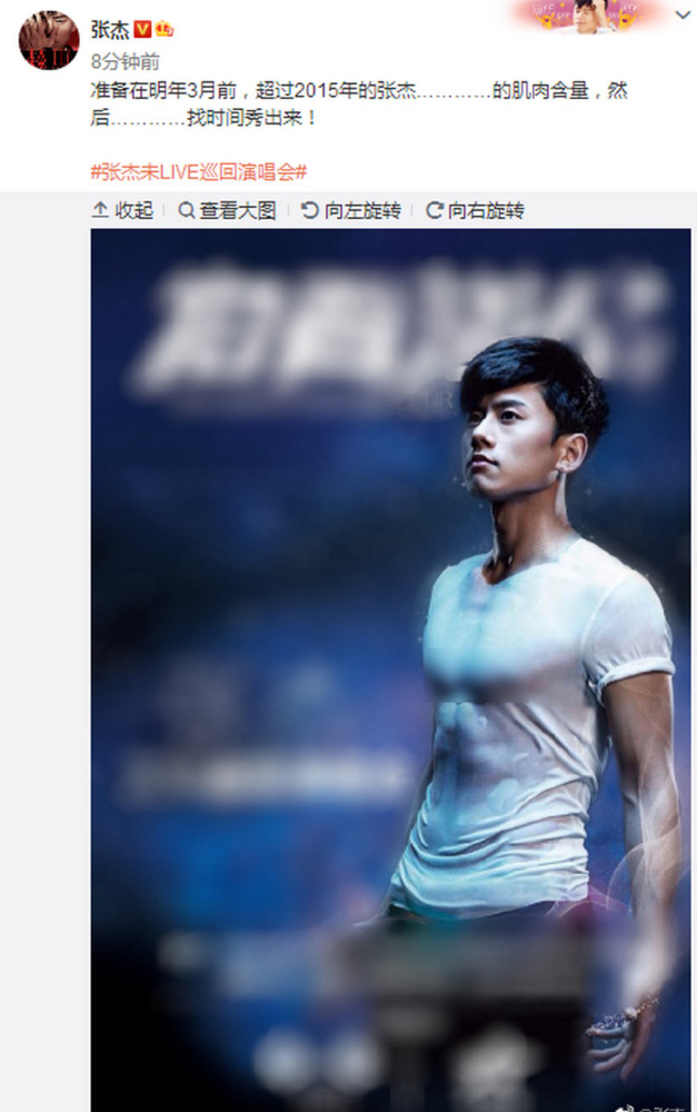 今天张杰发文:准备在明年3月前,超过2015年的张杰…………的肌肉含量,然后…………找时间秀出来!张杰还配上了一张曾经肌肉满满的照片,满屏的荷尔蒙!不过,这张图片是张杰2014年演唱会的海报,不是2015年的哦。