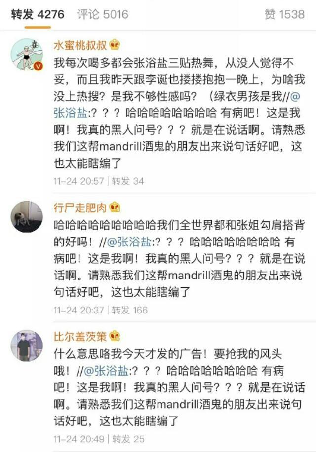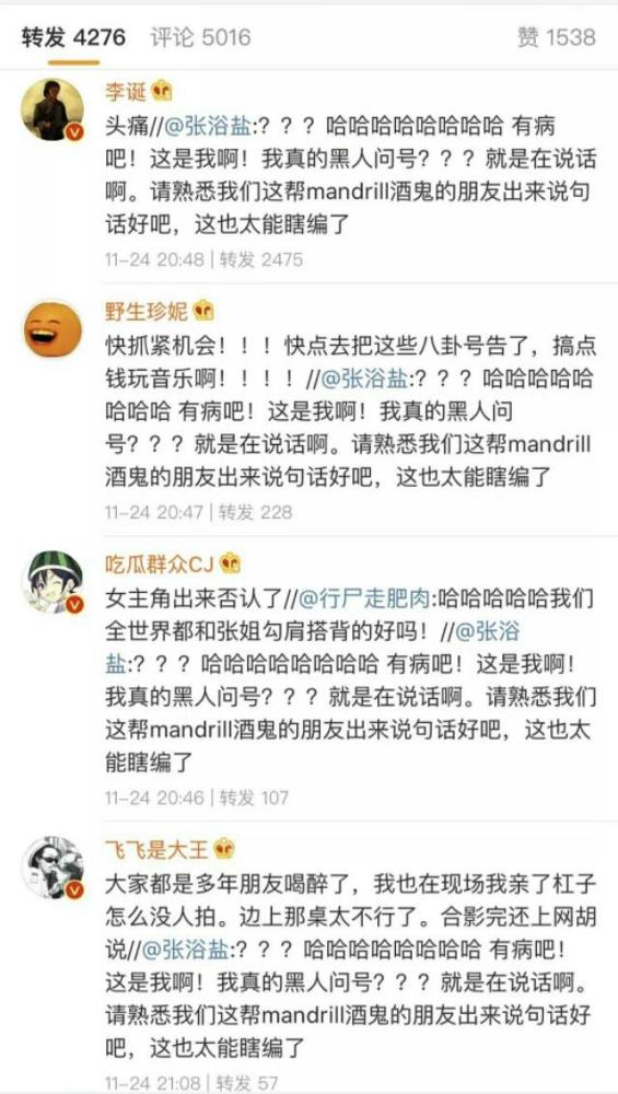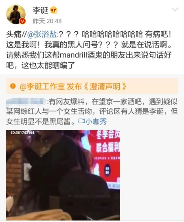 某音乐博主张浴盐发微博承认视频中的女子是自己,但她否认和李诞出轨,微博称“这也太能瞎编了”。李诞转发了她的微博并评论到:“头痛”。李诞圈内的朋友们倾巢出动在微博抱团为好友澄清,他们纷纷评论李诞与张浴盐的行为就是正常朋友间比较热情的互动,甚至不惜拉自己下水自曝更出格的自己都干过。张浴盐微博下的热评一表示心疼张浴盐,认为他们这种行为就像外国人那样是“纯洁不分性别的相处”。